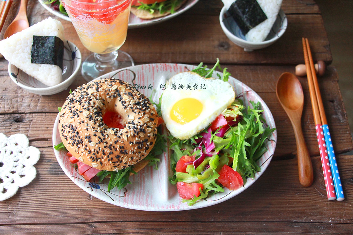 全麦黑芝麻贝果、金枪鱼千岛酱饭团、凉拌菜,搭配西瓜鲜梨汁、紫菜蛋花汤~