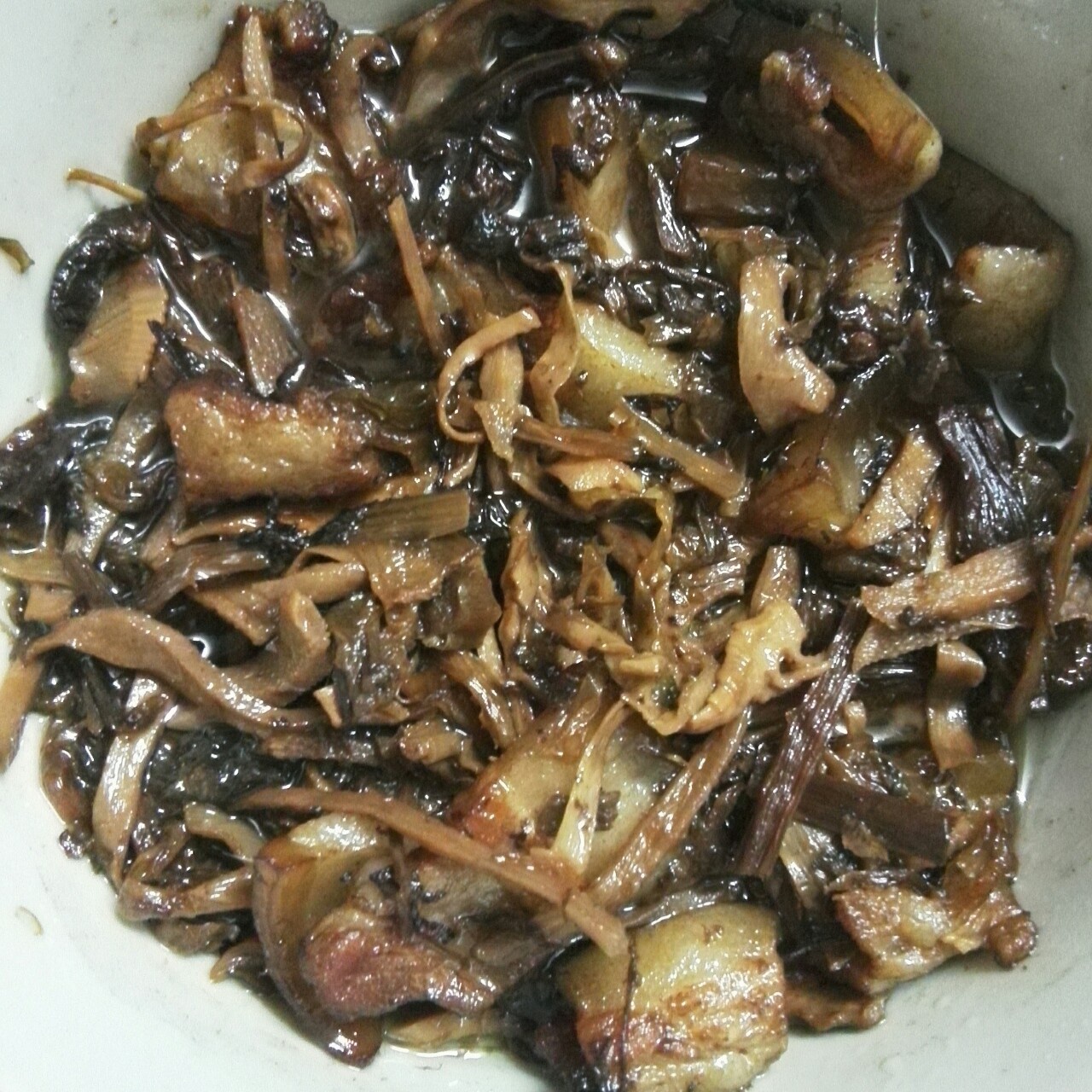 笋干菜烧肉。用的是店家给的做法。五花肉煮熟切薄片煸炒出油再放入泡好的笋...