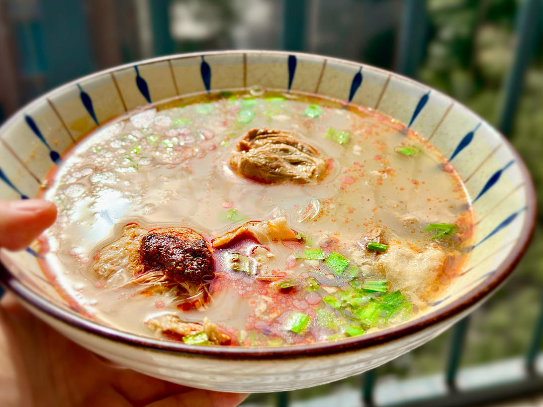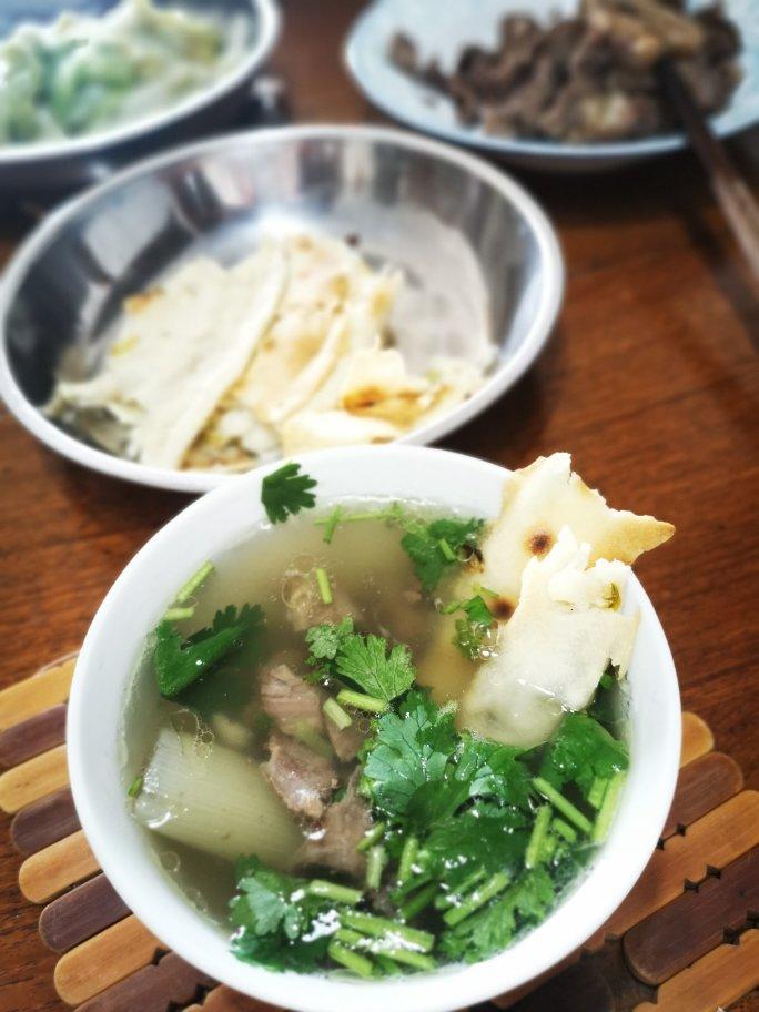 手抓羊做法的清炖羊汤,配上老家葱油大烙饼。