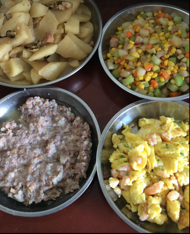 淡菜五花肉焖沙葛,炒丁丁,冬菜肉饼,虾仁炒蛋