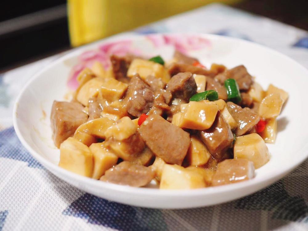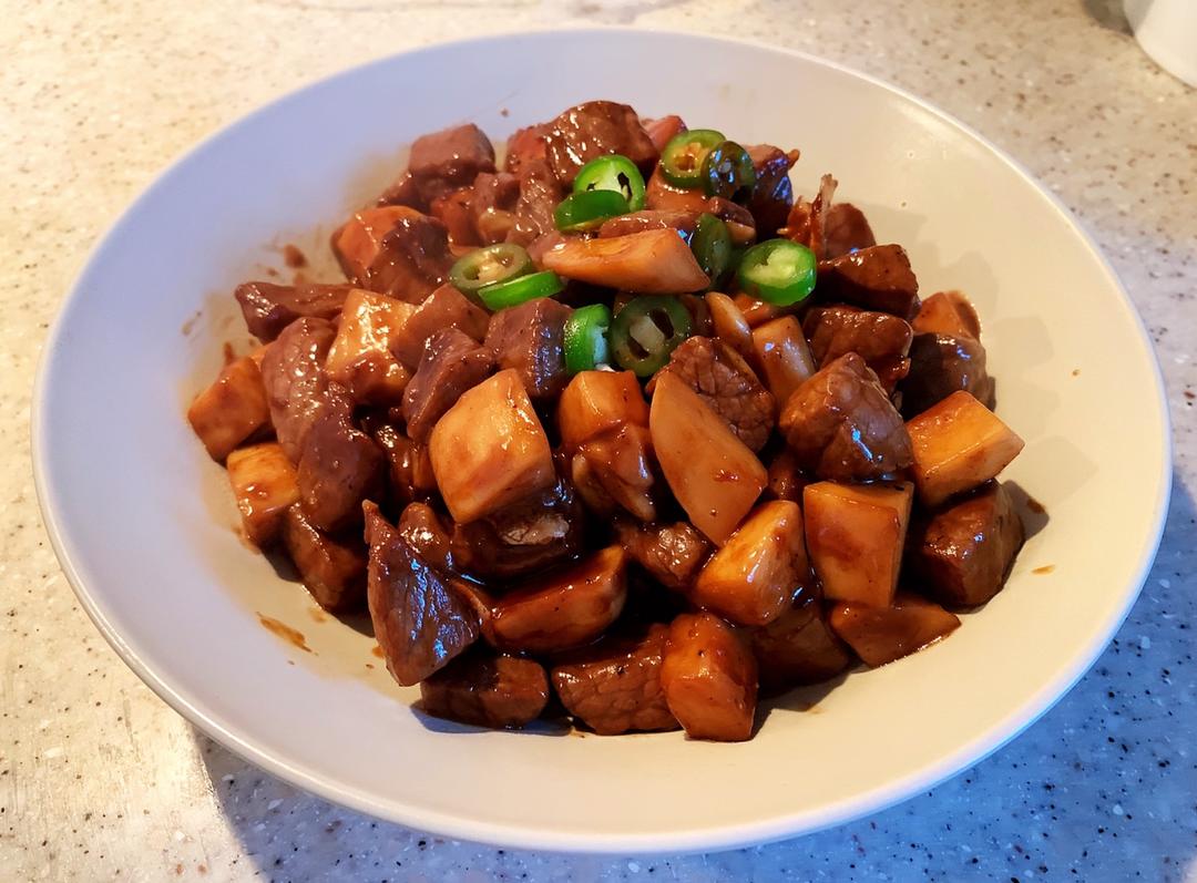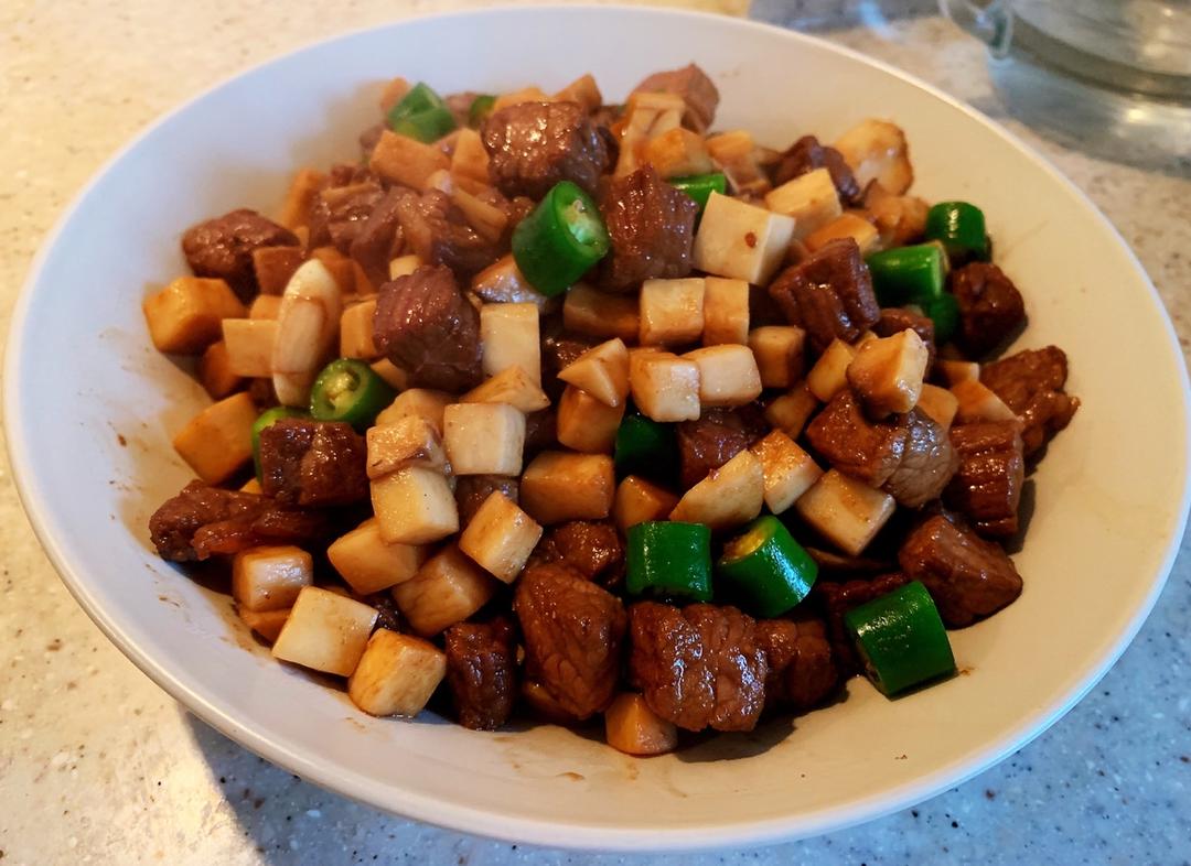 牛肉粒提前用耗油、生抽、芝麻油腌了半天,炒出来很嫩不柴,杏鲍菇扁的也很香,味道赞