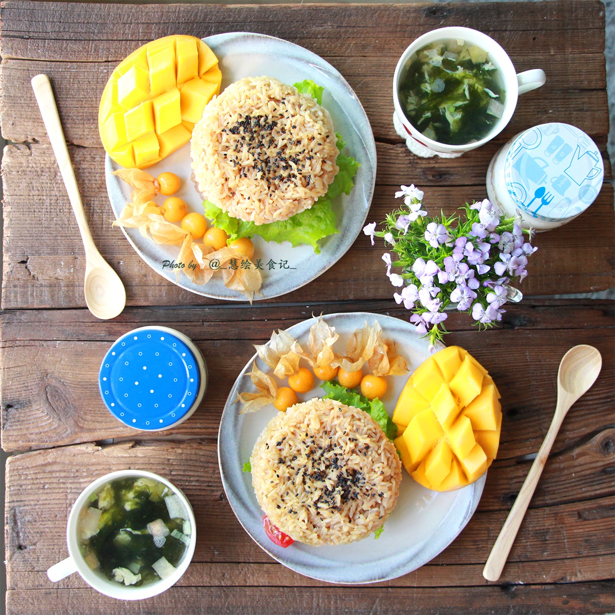 蔬菜牛肉米汉堡、紫菜蛋花汤,搭配燕麦酸奶杯、芒果、菇茑~米饭是用苋菜汁蒸的,没出来粉粉的颜...