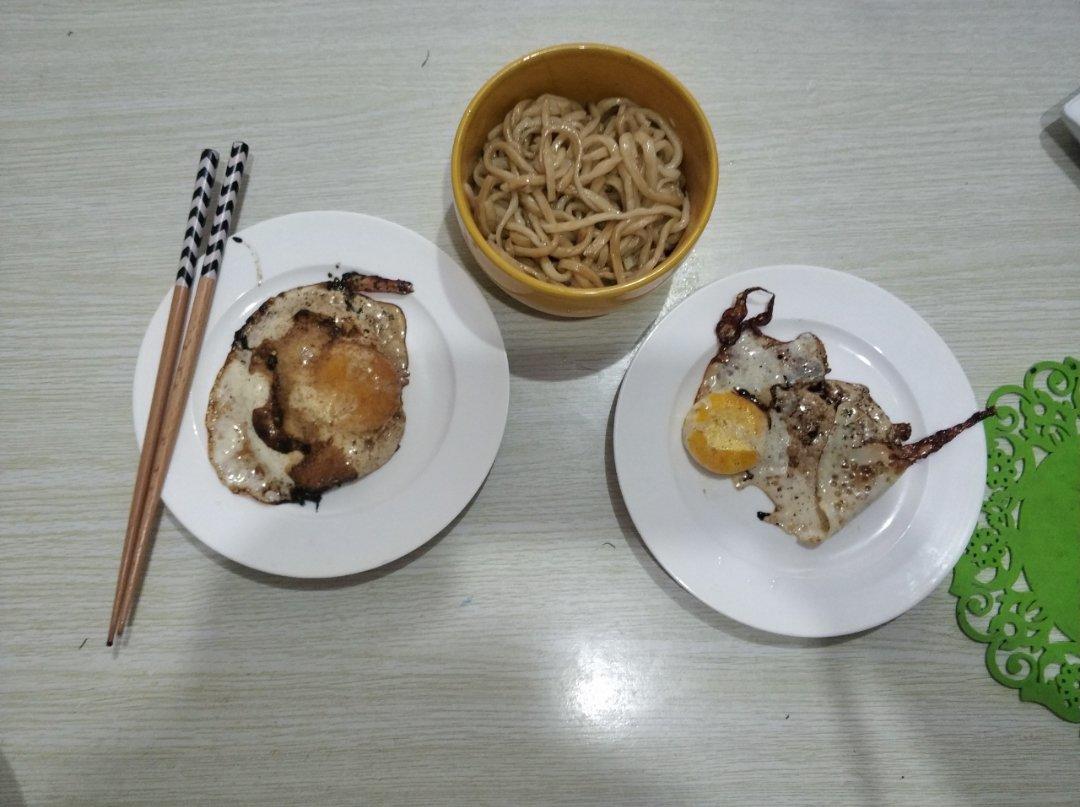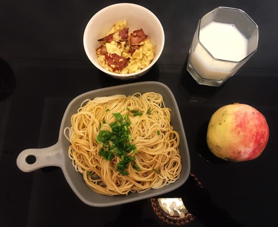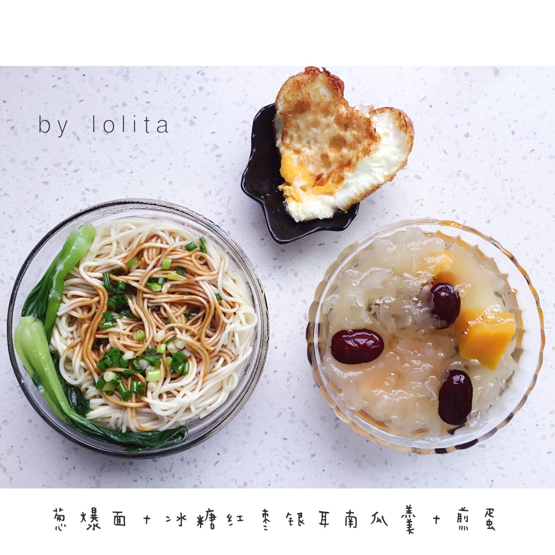 早餐:葱爆面+冰糖红枣银耳南瓜羹+煎蛋~