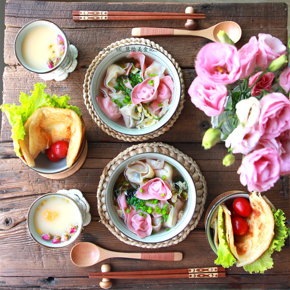 双色鲜肉小馄饨、鸡蛋灌饼、百香果玫瑰多多苏打水 ~~