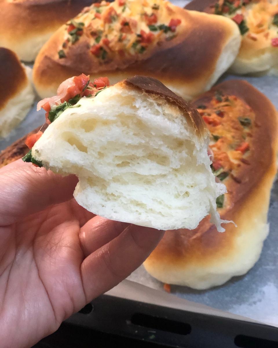 加入了隔夜的烫面种,做出来的面包果然更加松软可口!