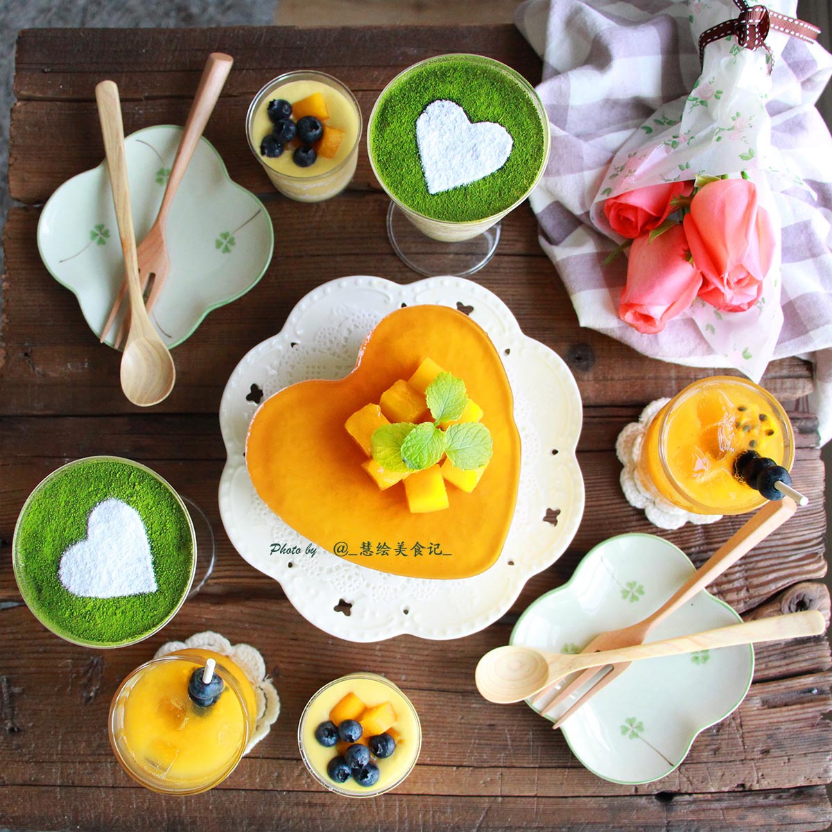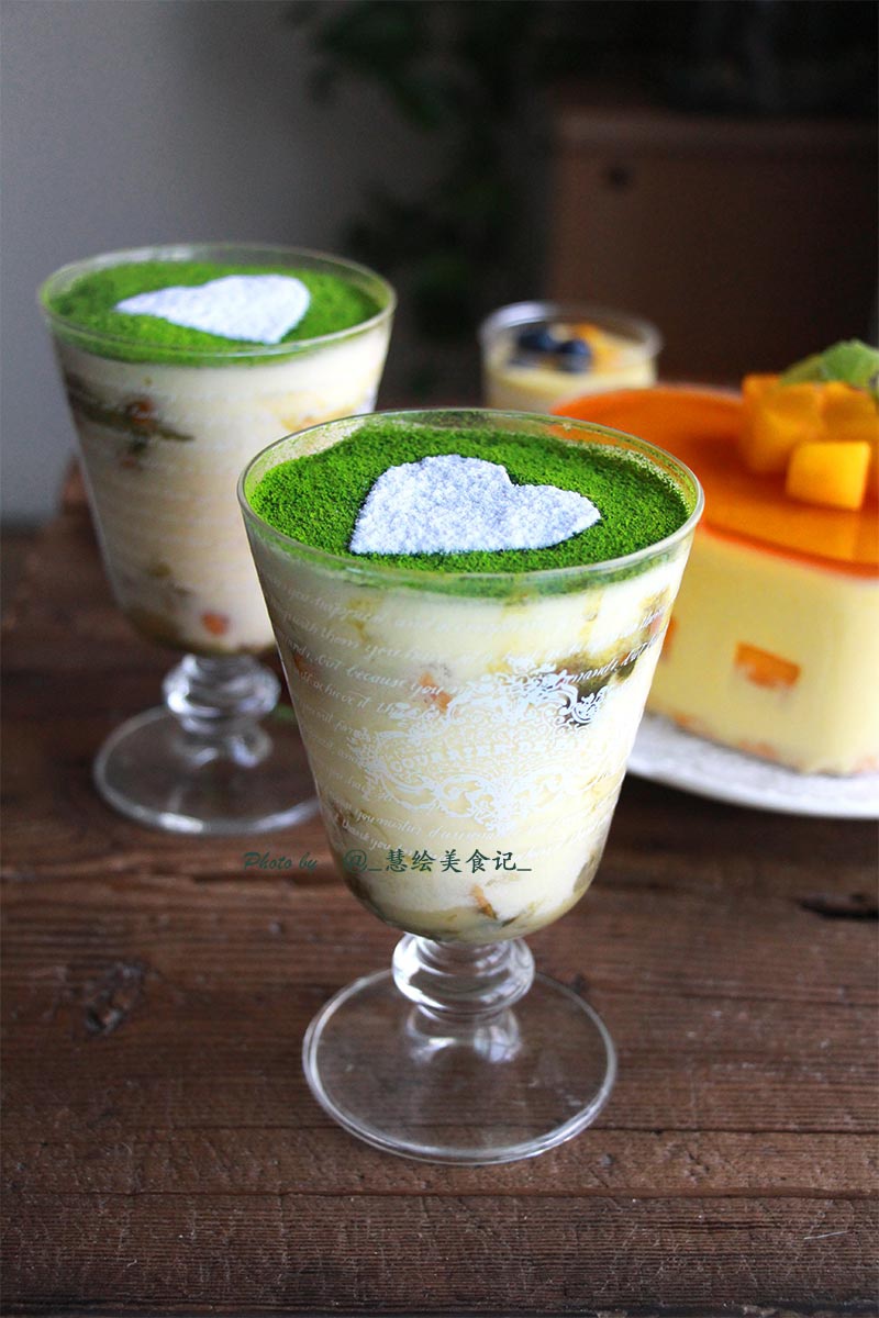 七夕的甜蜜早餐~心形芒果慕斯、抹茶提拉米苏、蓝莓无花果芒果苏打水~