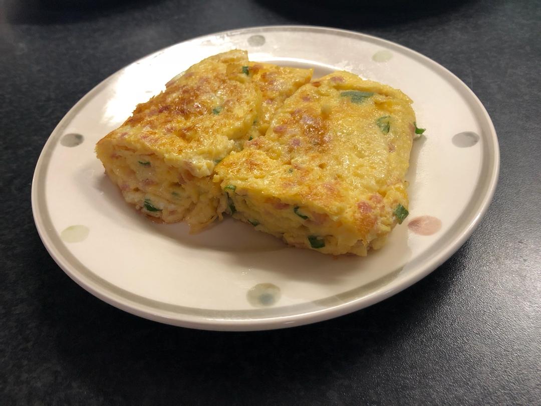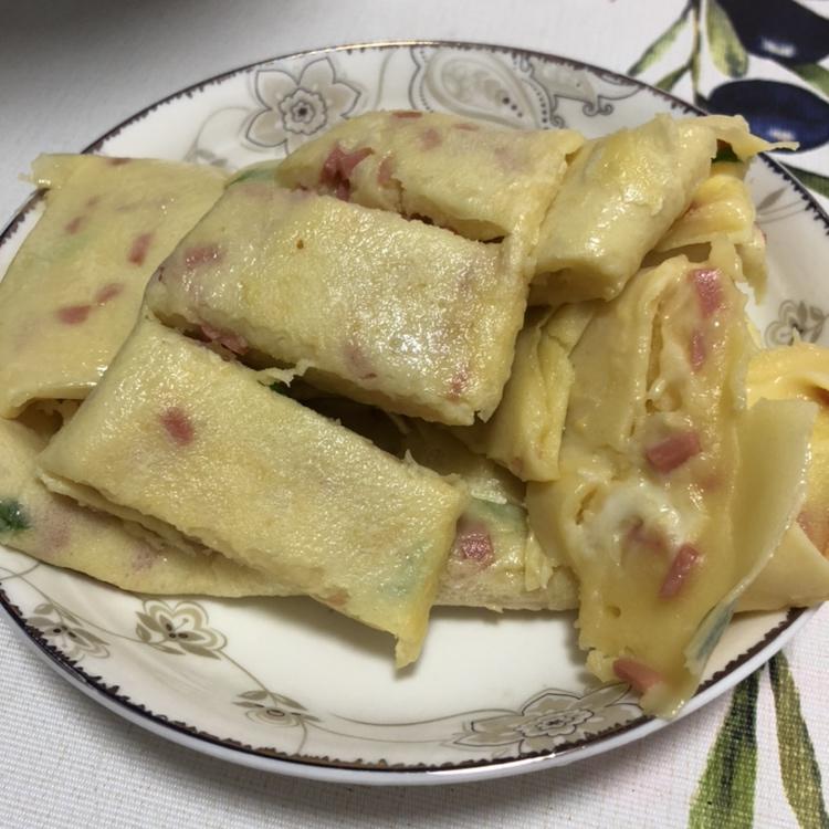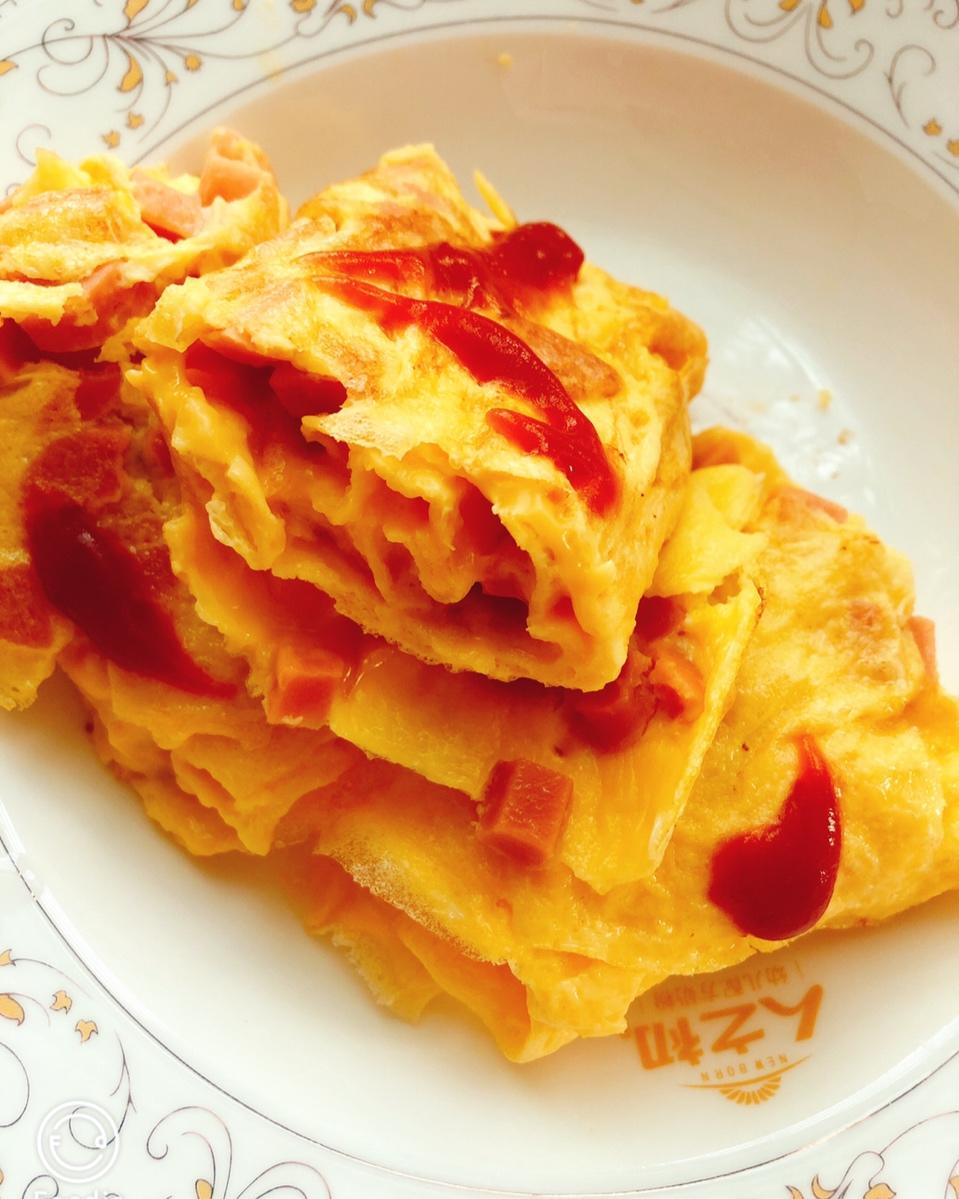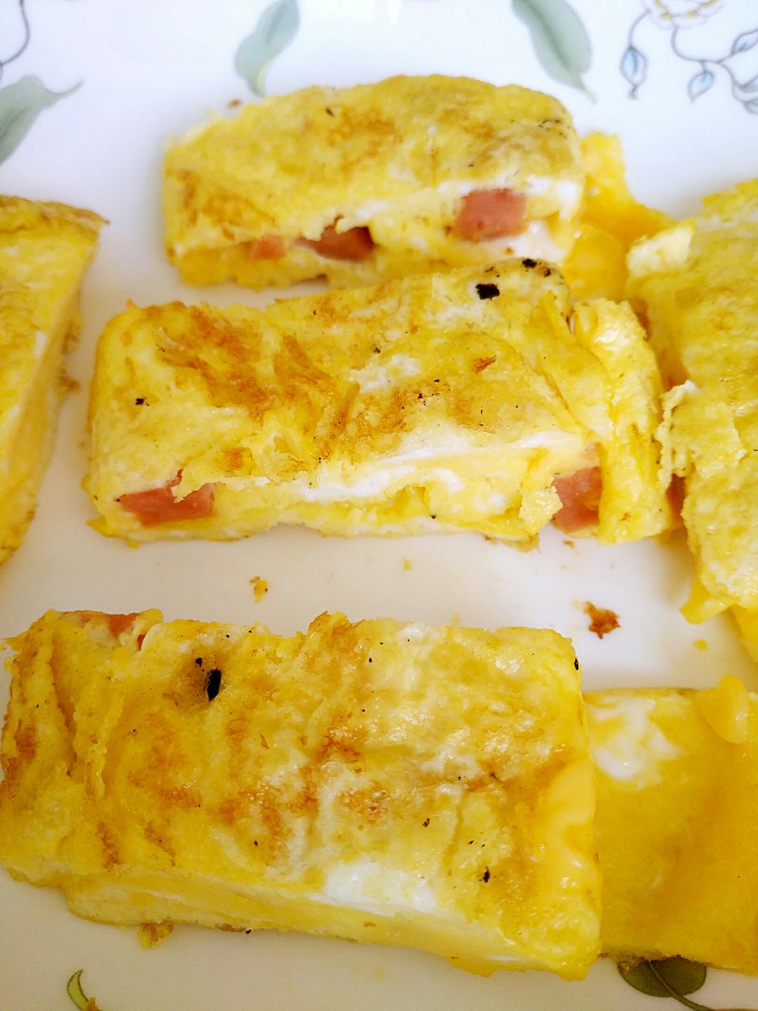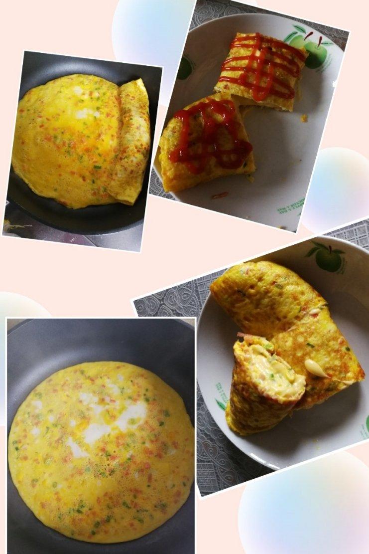 用自己种的黄萝卜代替了火腿肉,自家养的鸭蛋放了点白胡椒,放了4片芝士,4个不太大的蛋,两卷,娃吃了1/3才想起放番茄酱,...