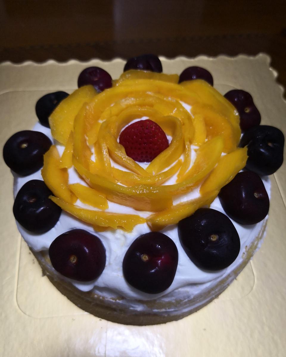 6寸戚风蛋糕。中间夹草莓酱和奶油,表面抹奶油,车厘子 芒果 草莓 做装饰。