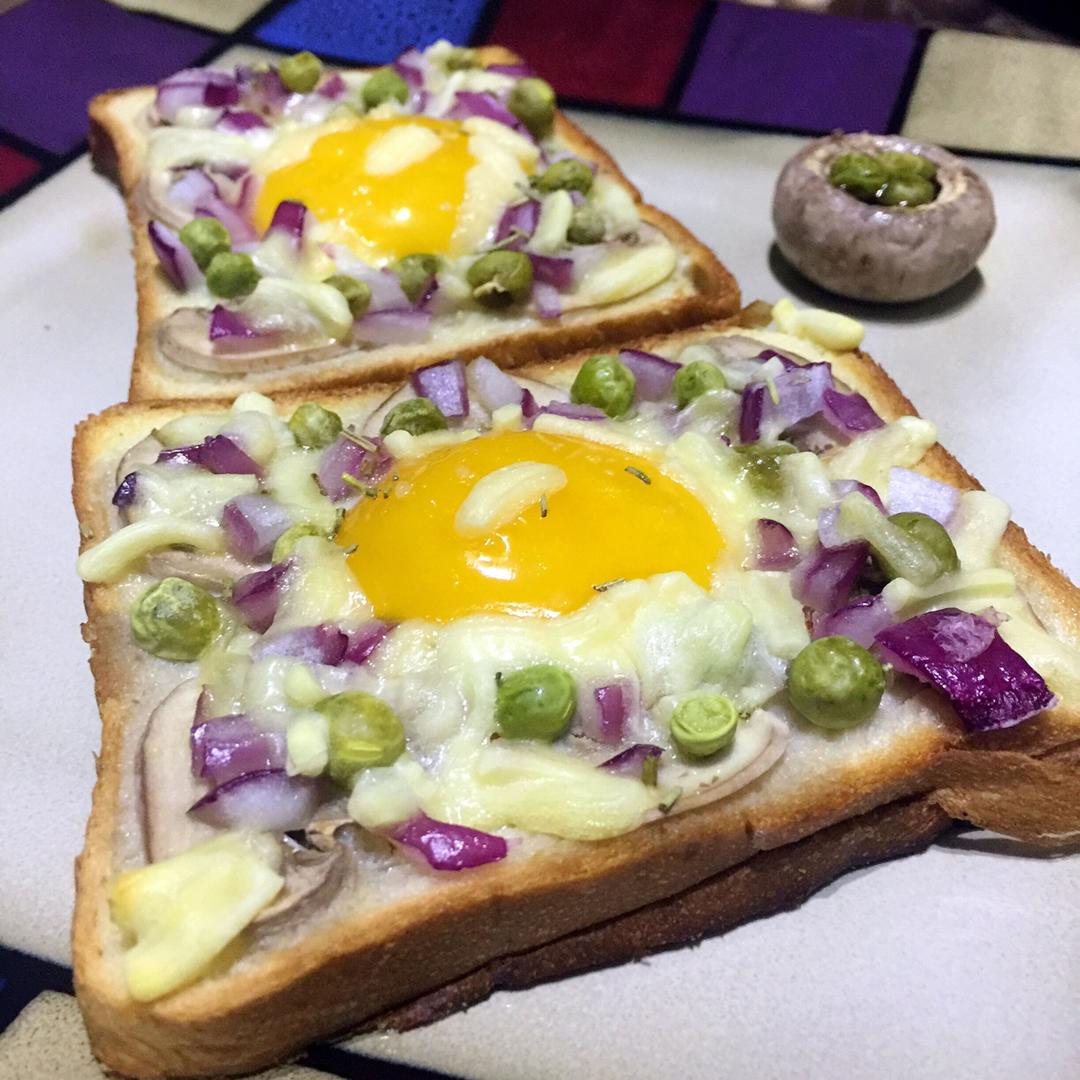 突发奇想,家里就地取材只用了白菇,洋葱和青豆,打蛋的时候可以留一半蛋清在碗里,剩下的放吐司上刚刚好,撒了一点点披萨草和迷...