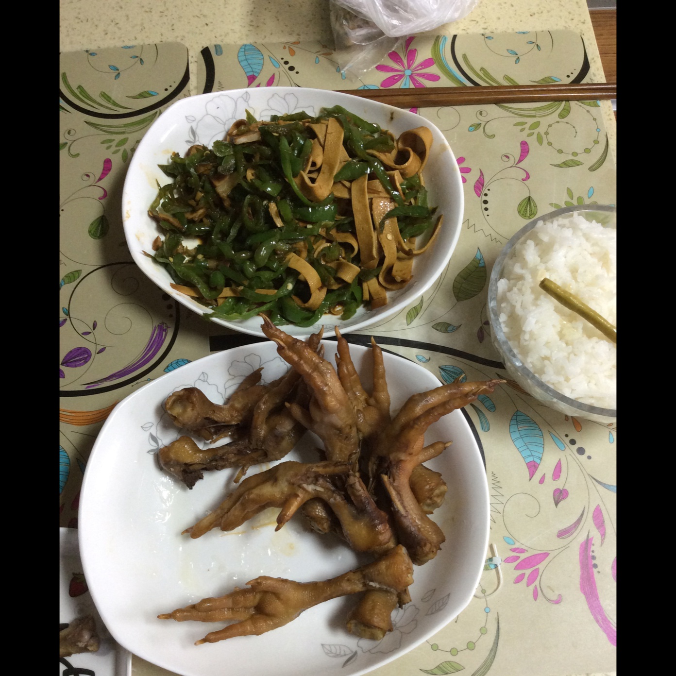 卤鸡爪,卤肉卤千张炒青椒。味道倍儿棒