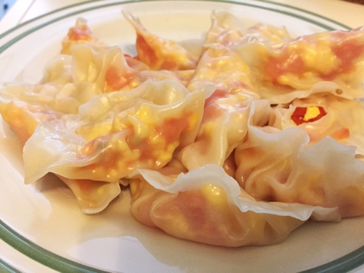 番茄鸡蛋馅儿的饺子。外面找不到,就自己做来吃。好吃。就是有个皮儿破了