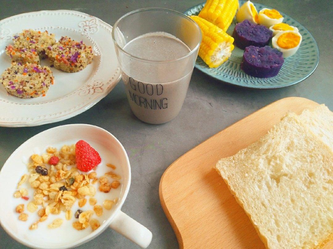 嘻嘻~豆浆粉+全脂奶+紫薯泥+魔芋米+坚果+枸杞=完美的早餐
