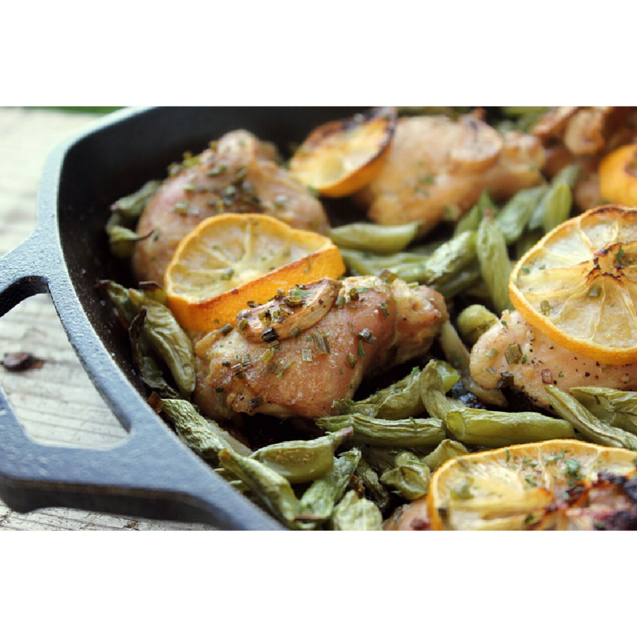 一锅出的烤鸡腿。去年种的豆角长老了没收,今年自己长出了几簇,又不够炒一顿的,就放到了烤鸡里...