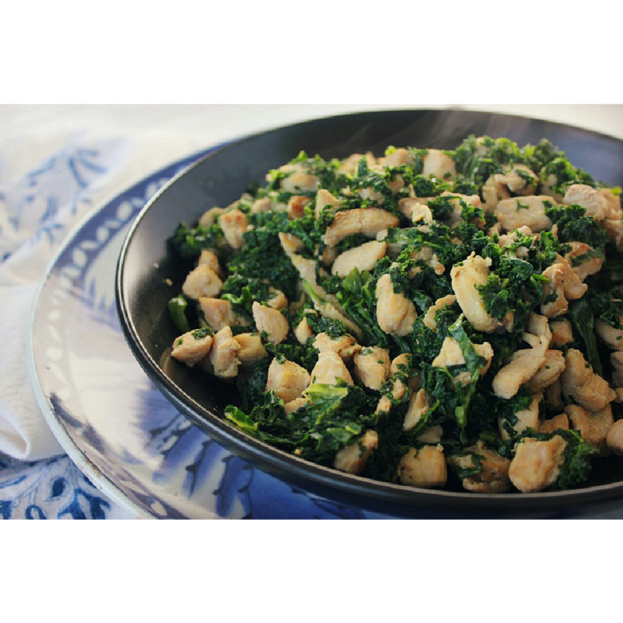 柠檬烤鸡胸,菠菜。鸡胸先在铸铁锅烤到表面焦然后再煮一会