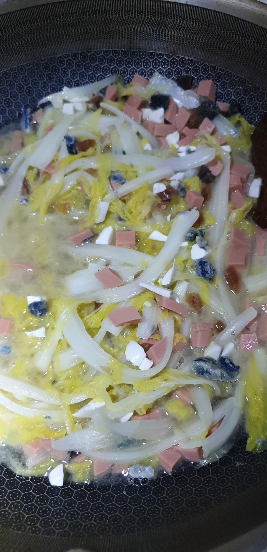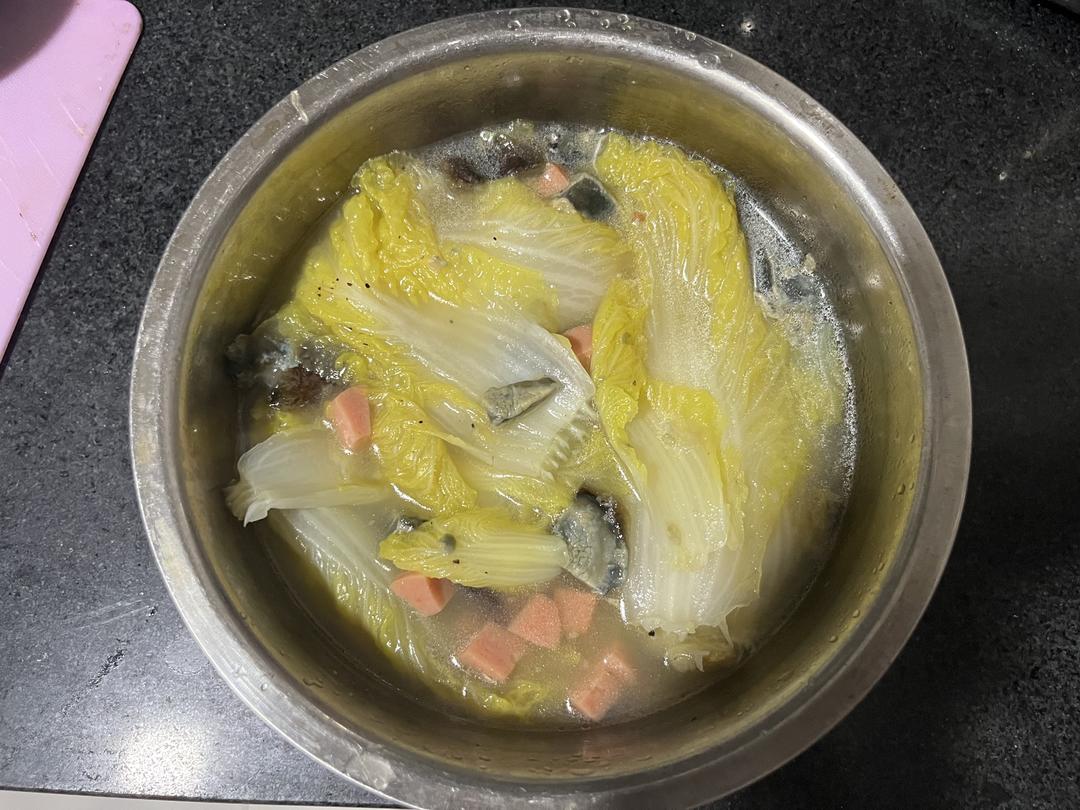 食材:娃娃菜,火腿,皮蛋,瘦肉,豆腐,盐,生抽,油,姜片