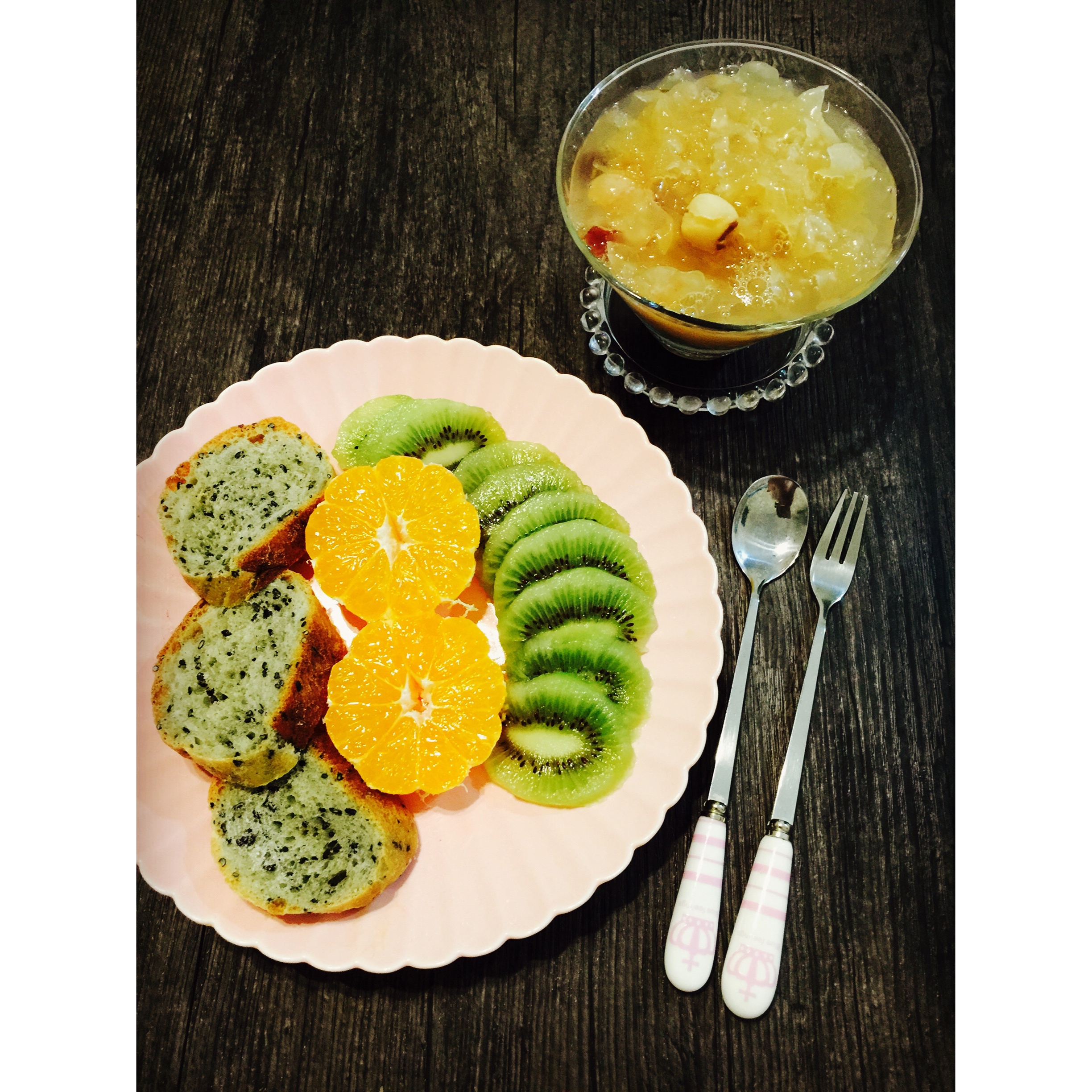 黑芝麻面包+蔓越莓银耳莲子汤+水果