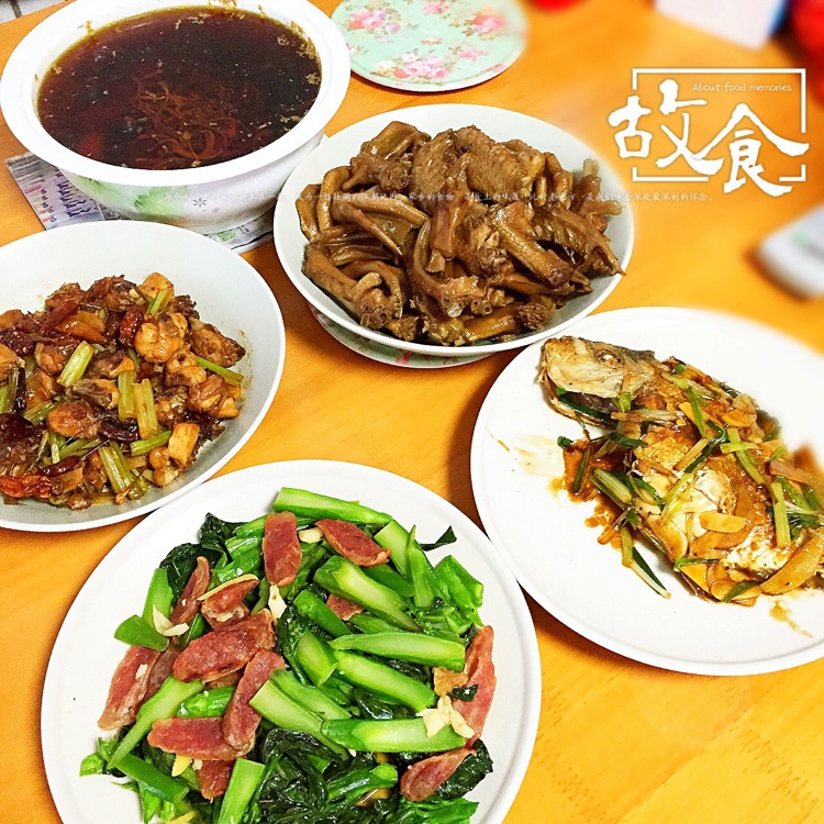 晚餐:卤水鸭翅鸭脚、辣子鸡、煎金鲳鱼、腊肉姜丝炒芥兰,虫草花炖瘦肉汤、主食米饭。