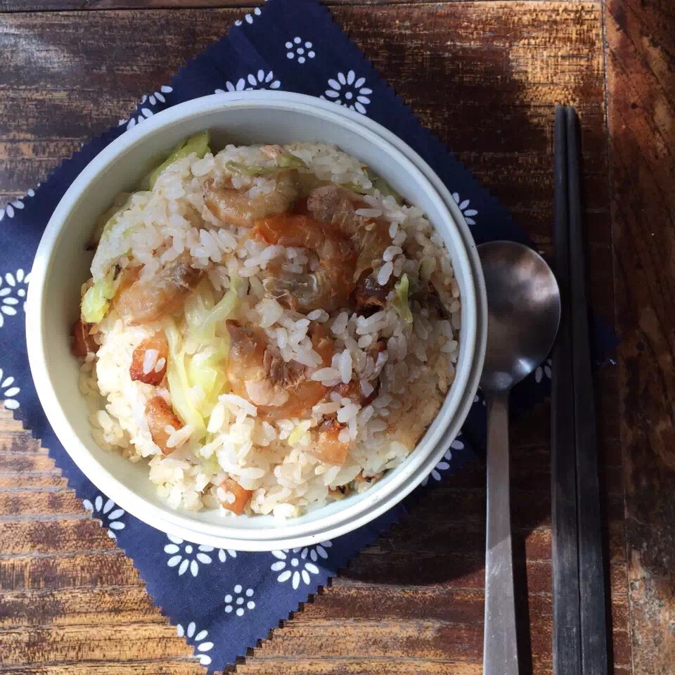 猪油渣卷心菜虾干焖饭。