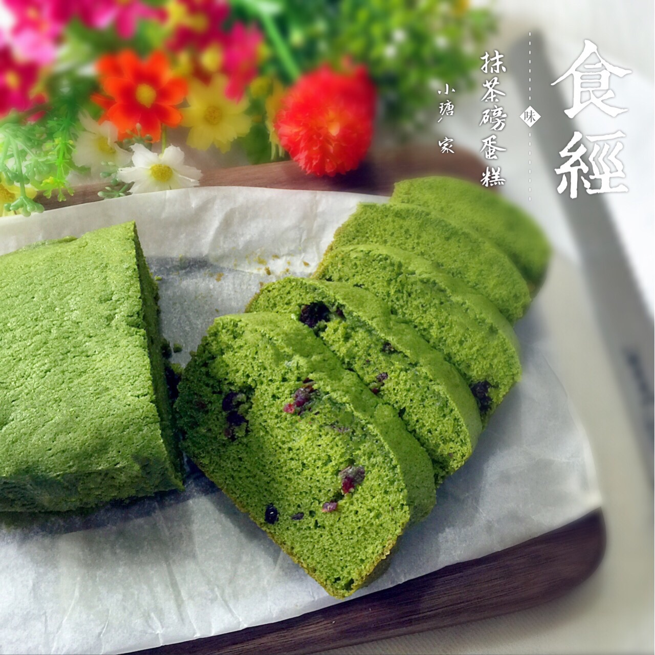 抹茶磅蛋糕。加了蔓越莓,两者的搭配也是很棒的。