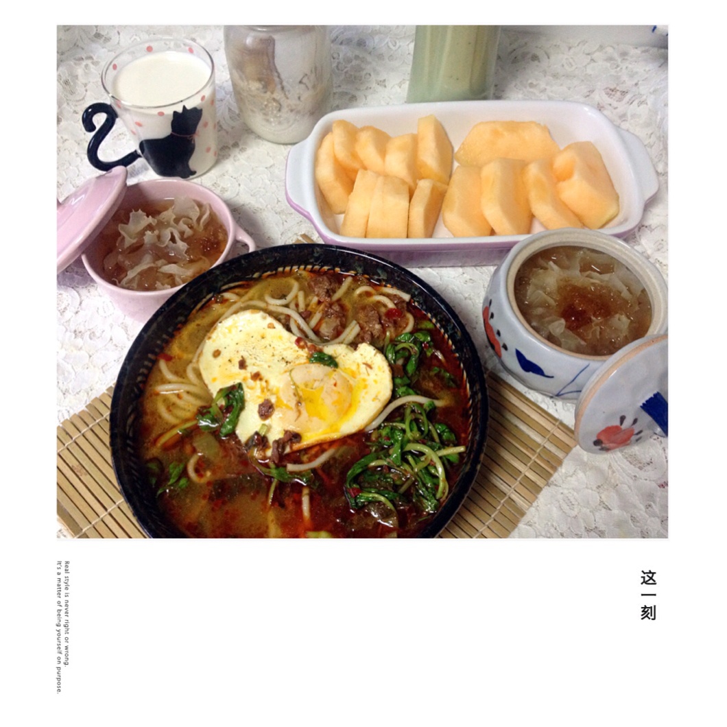 早安!桃胶银耳,香蕉牛油果奶昔,卡乐比酸奶,爱尝鲜买的贵州牛肉粉,牛肉粉又一股脑把辣子放进去了,把女儿和我辣的够呛,下次...