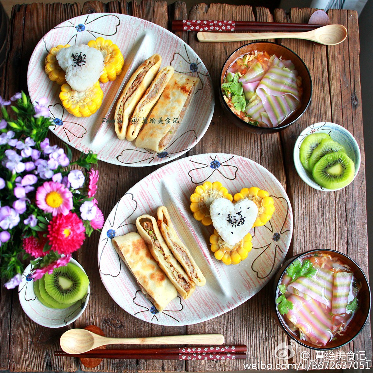 早晨起来做了彩虹面片汤、心形金枪鱼饭团,搭配昨晚上烙的猪肉饼,还有玉米、猕猴桃~~