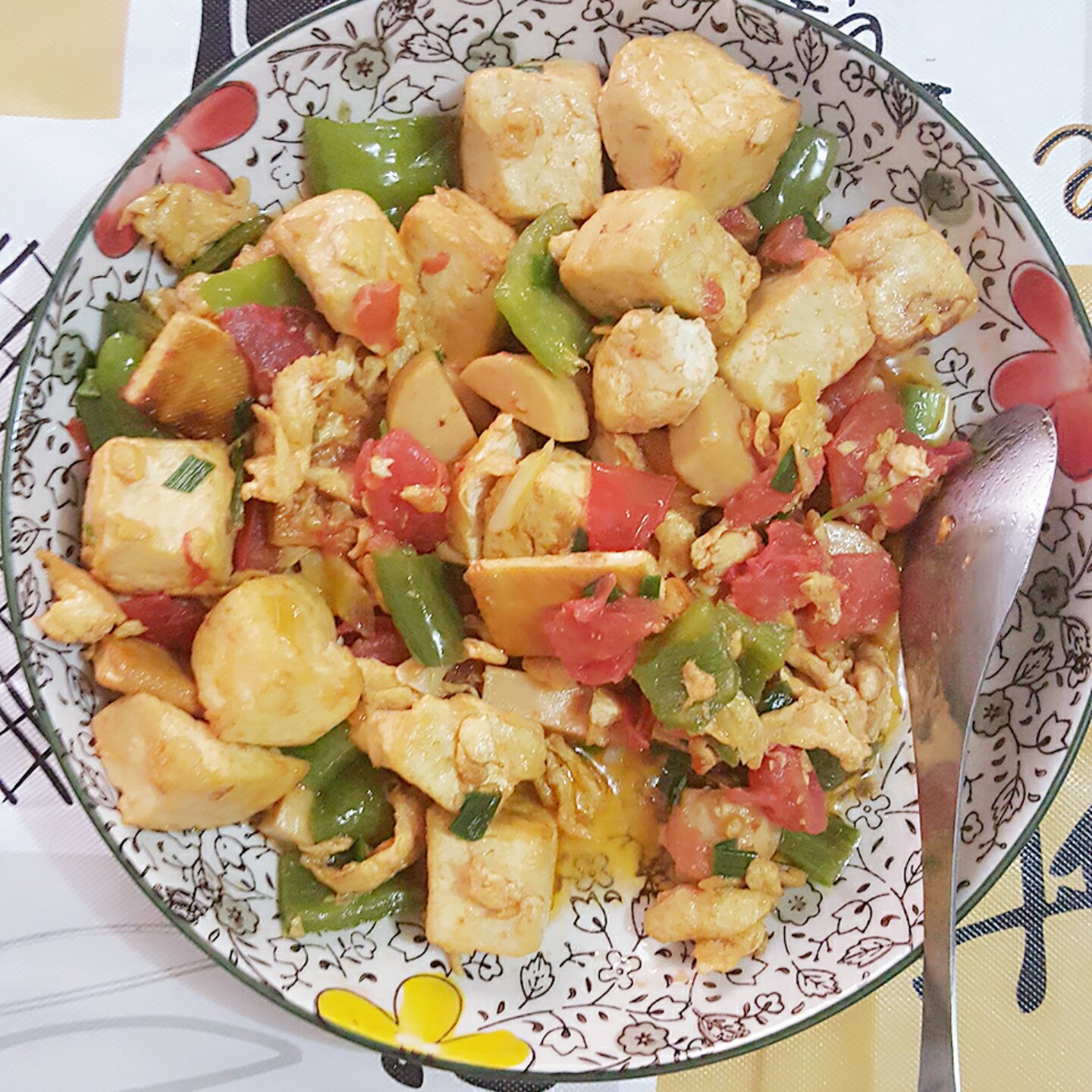 加了香干和西红柿,豆腐切的太大块了,不过味道还可以,没有放淀粉。
