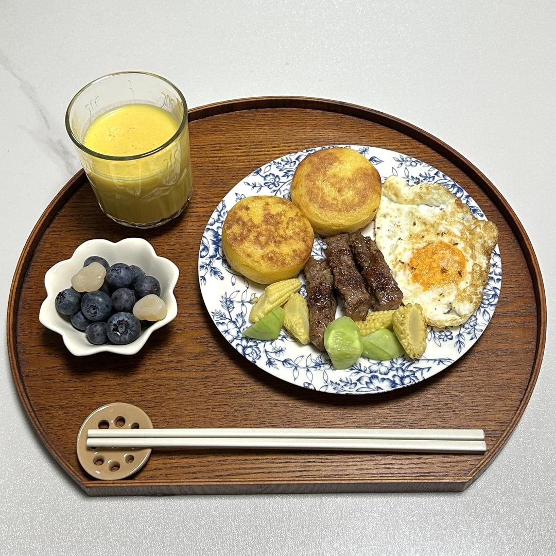 今日早餐:豆浆拿铁,玉米饼,煎蛋,牛排,黄瓜玉米笋,蓝莓。