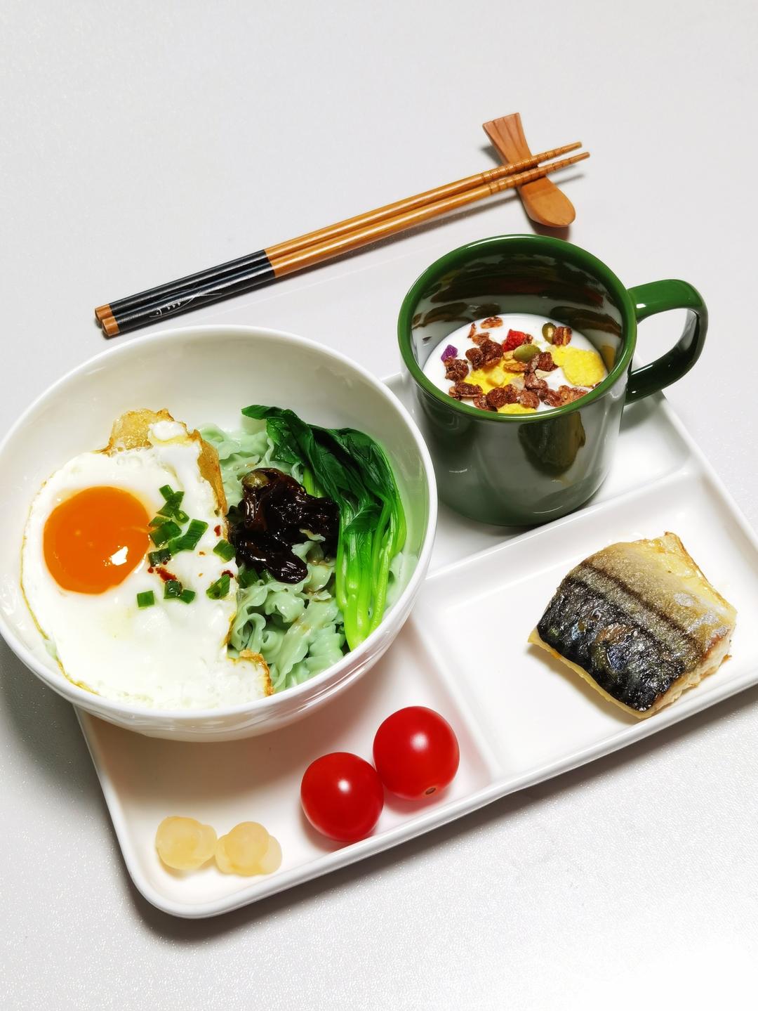 今日早餐:葱油拌面(+青菜煎蛋),酸奶麦片,煎青花鱼,小番茄。