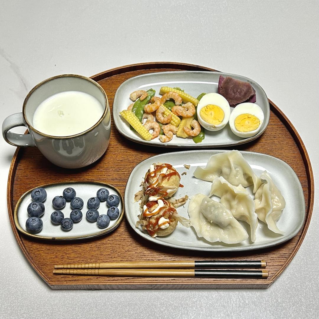 今日早餐:热奶粉,荷兰豆玉米笋炒虾仁,鸡蛋,紫薯,自制小丸子和饺子,蓝...