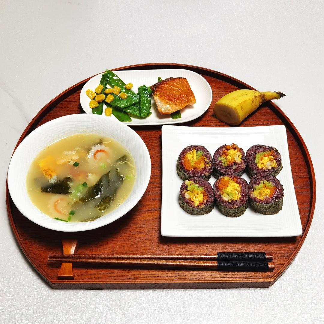 今日早餐:荷包蛋裙带菜汤,寿司(紫米糙米饭),荷兰豆 三文鱼,香蕉。
