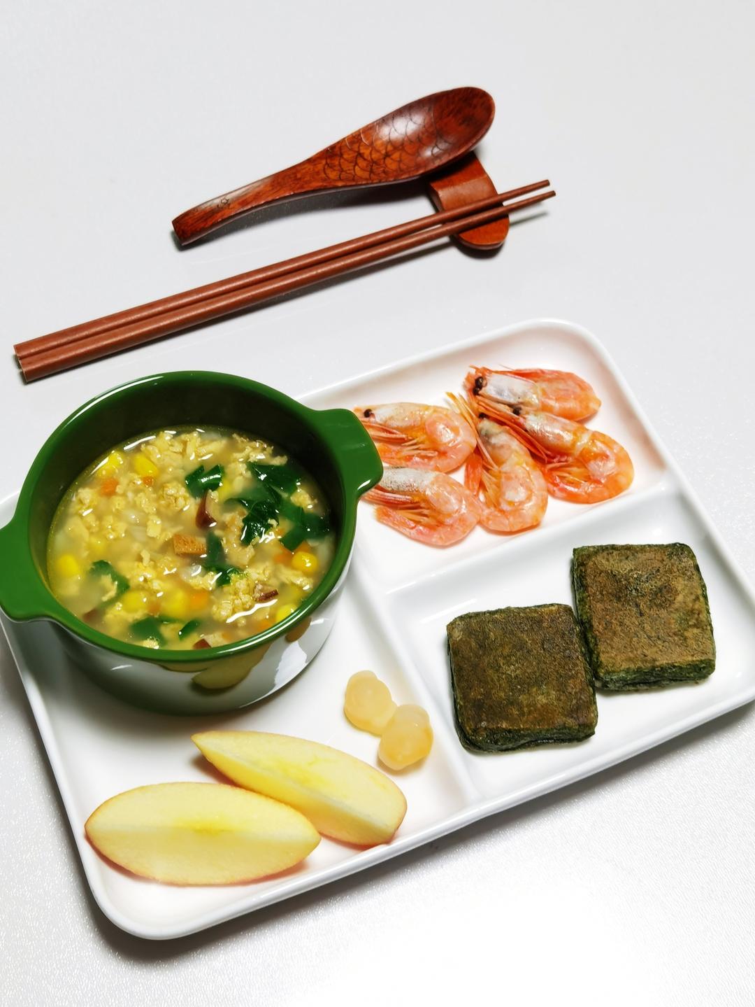 今日早餐:银耳红枣莲子汤,青菜玉米牛肉海苔饭团,鸡蛋,红薯,小番茄。