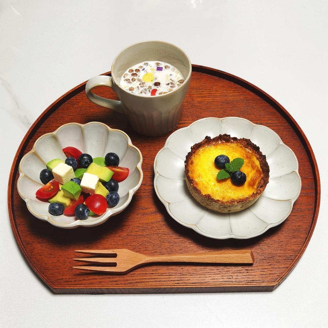 今日早餐:热奶粉麦片,香蕉燕麦挞,水果奶酪。