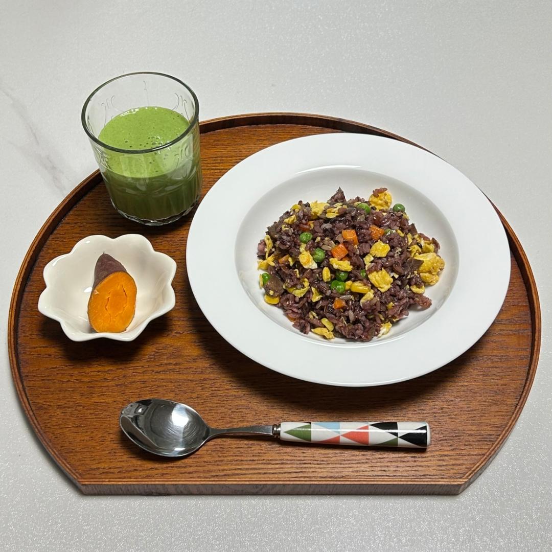 今日早餐:羽衣甘蓝香蕉腰果奶,牛肉鸡蛋炒杂粮饭,红薯。
