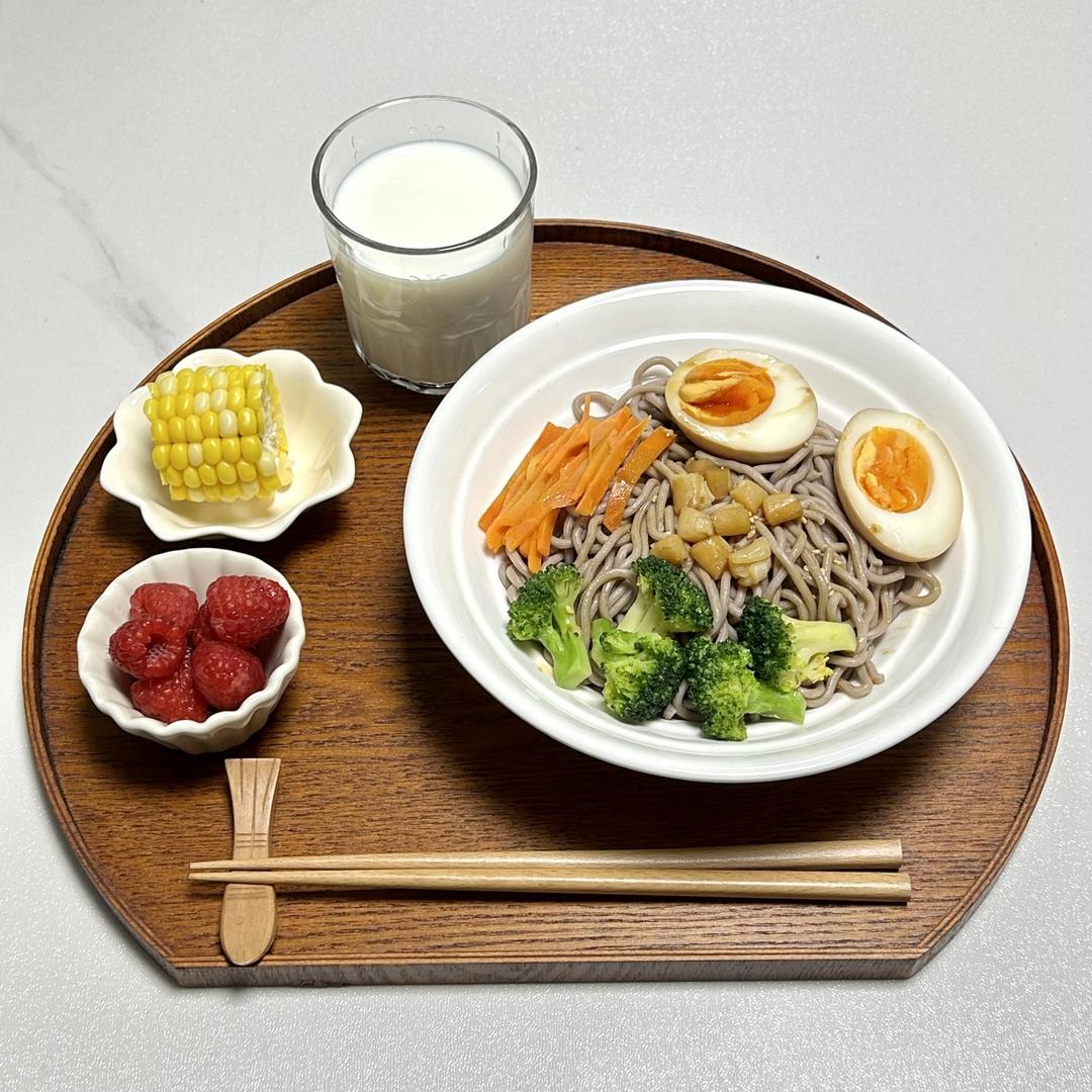 今日早餐:牛奶,凉拌荞麦面(西兰花胡萝卜干贝鸡蛋),玉米,树莓。