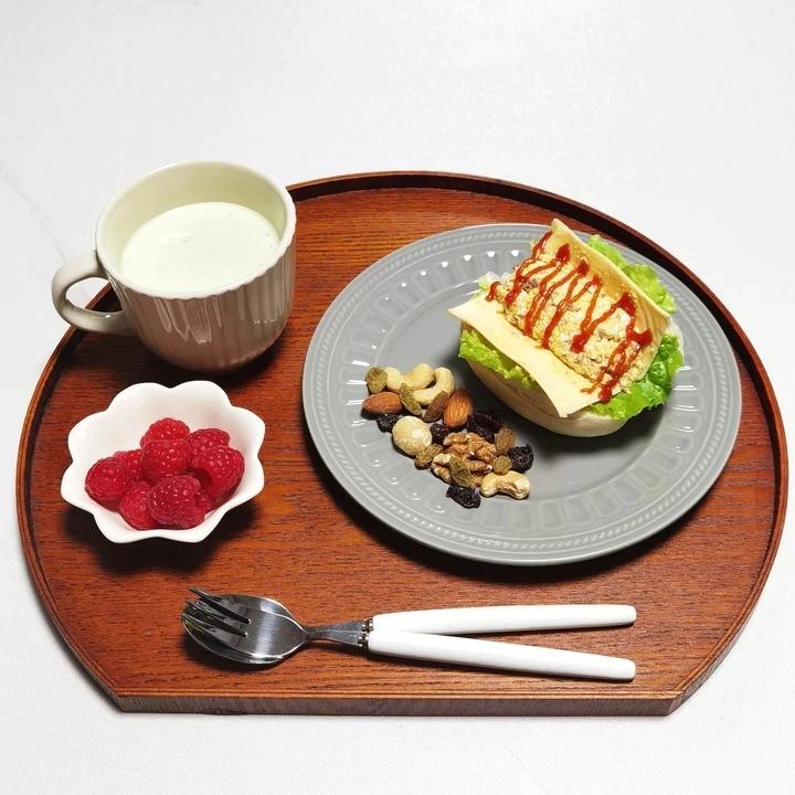今日早餐:奶粉麦片,空气炸锅烤馒头片,滑蛋 牛油果,鳕鱼,南瓜,蓝莓。