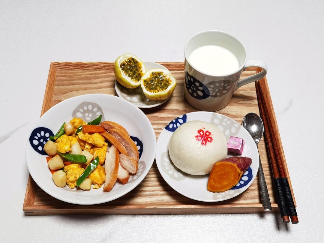 今日早餐:热奶粉,青椒带子炒鸡蛋,鸡胸肉,自制豆沙包,红薯,奶酪,百...