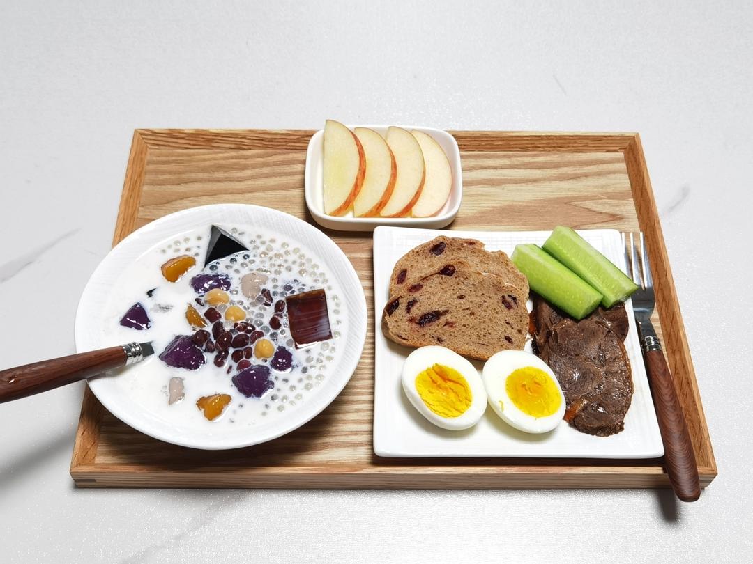 今日早餐:牛奶芋圆西米露,鸡蛋,全麦餐包,牛肉,黄瓜,苹果。