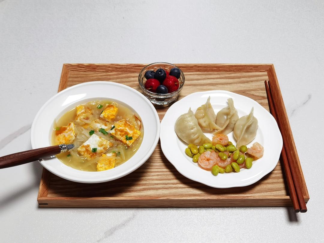 今日早餐:萝卜丝荷包蛋汤,莲藕猪肉蒸饺,毛豆炒虾仁,山楂 蓝莓。
