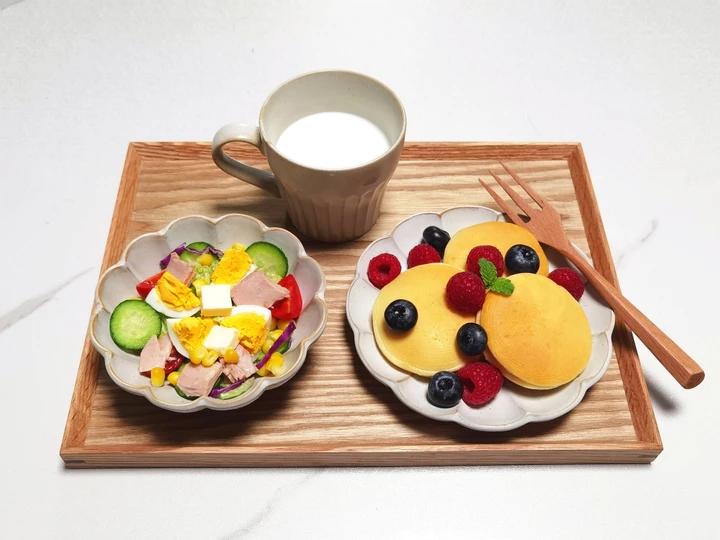今日早餐:牛奶,铜锣烧+蓝莓树莓,金枪鱼鸡蛋奶酪沙拉。