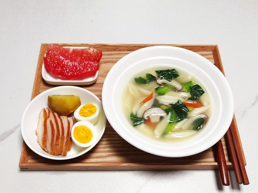 今日早餐:青菜香菇剪刀面,鸡蛋 鸡胸肉 番薯,红柚。