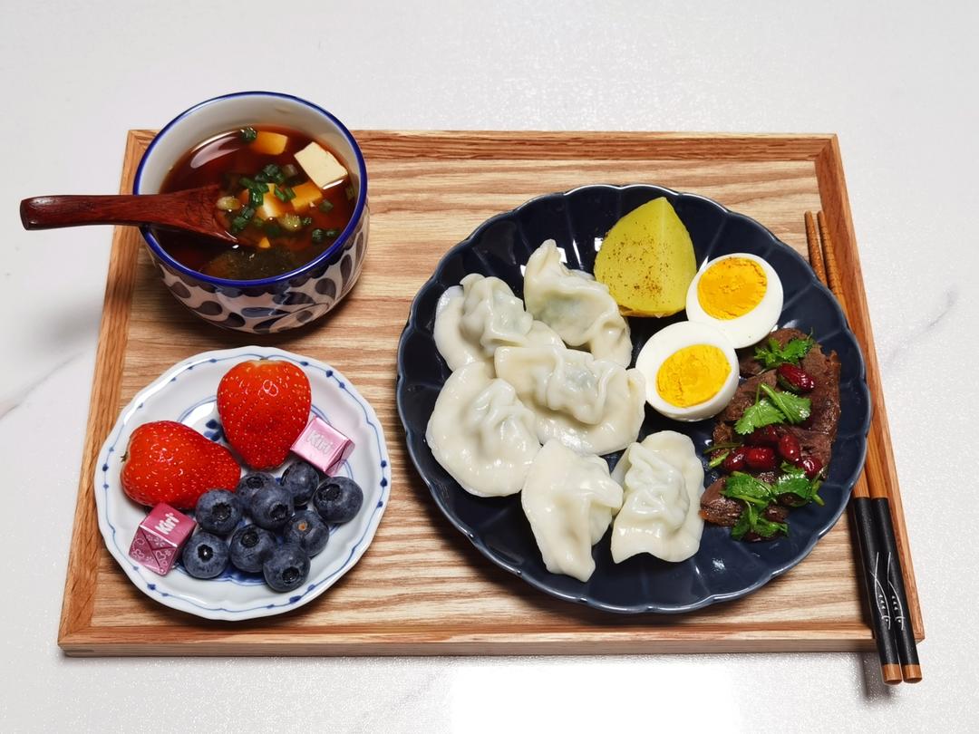 今日早餐:味增汤,鲅鱼水饺,鸡蛋,香菜花生拌牛肉,土豆,草莓,蓝莓,...