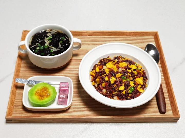今日早餐:紫米蛋炒饭(鸡蛋培根虾仁杂菜),紫菜虾皮汤,羊角蜜,奶酪。...