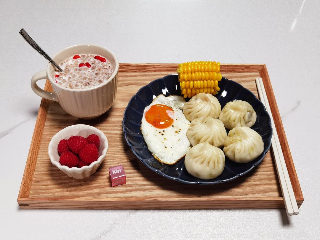 今日早餐:奶粉冲麦片,自制荠菜猪肉包,煎蛋,玉米,树莓,奶酪。