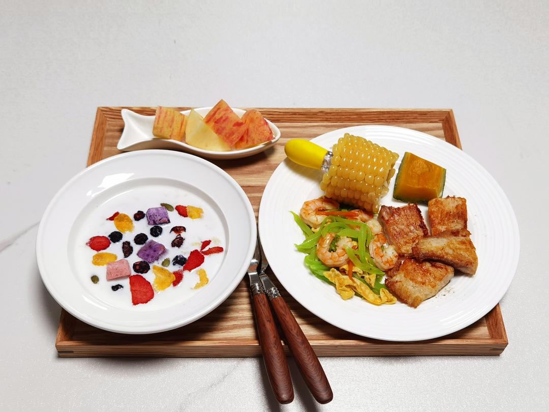 今日早餐:麦片冲牛奶,莴笋蛋丝炒虾仁,煎鲷鱼,玉米,南瓜,苹果。