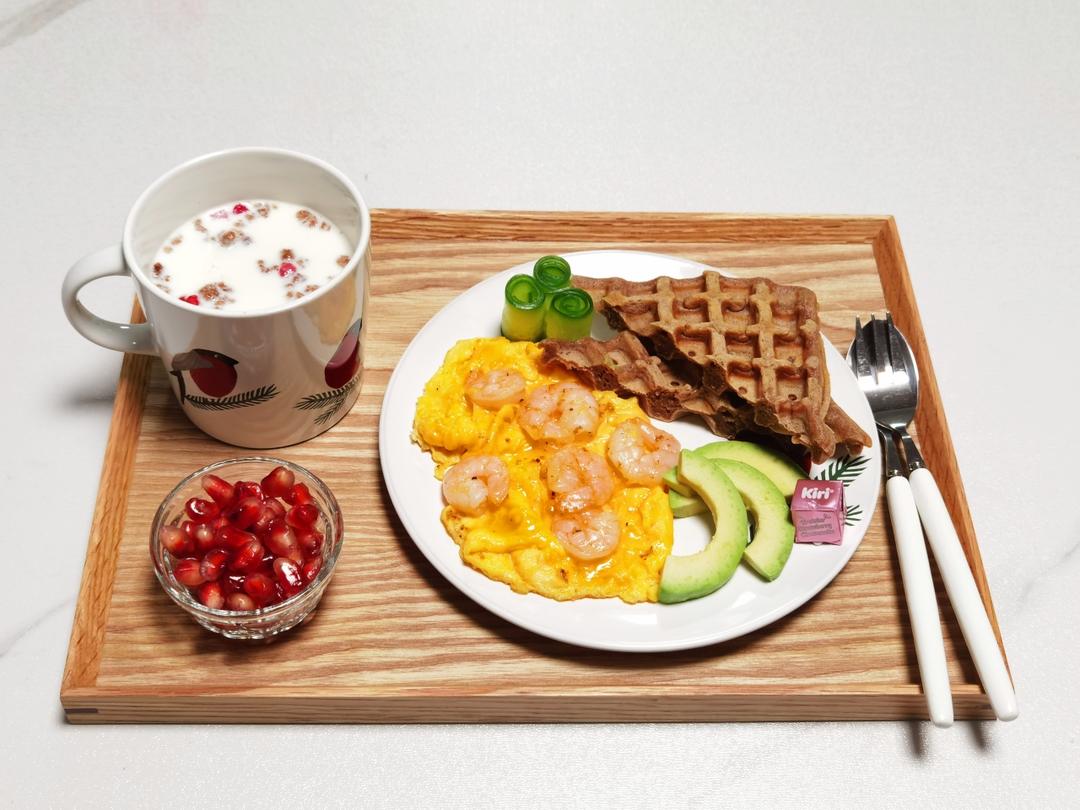 今日早餐:热奶粉麦片,自制可可华夫饼 ,虾仁滑蛋,牛油果,小黄瓜卷,...