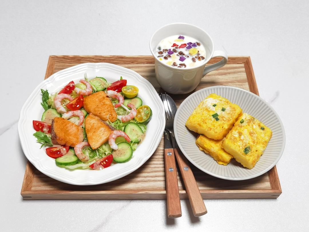 今日早餐:三文鱼北极甜虾沙拉,西多士,奶粉麦片。