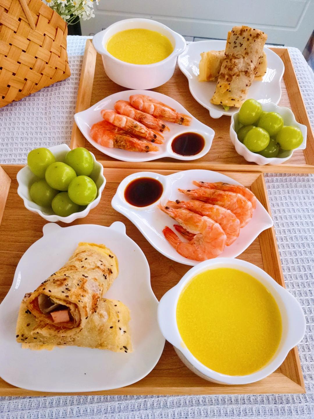 杂疏卷饼、水煮虾、葡萄、南瓜糊