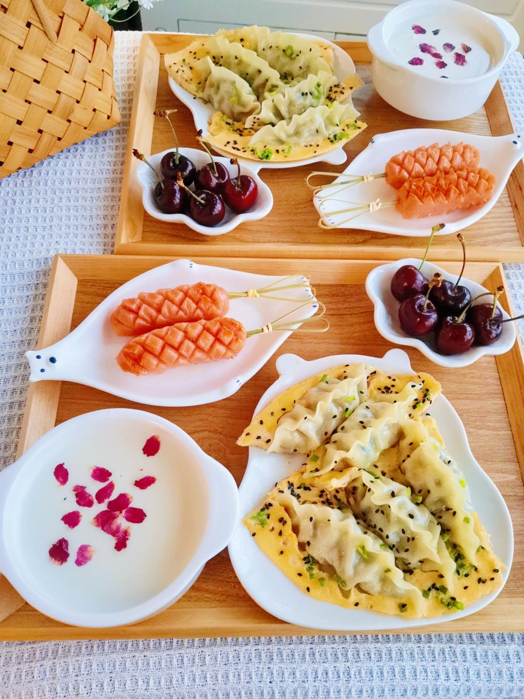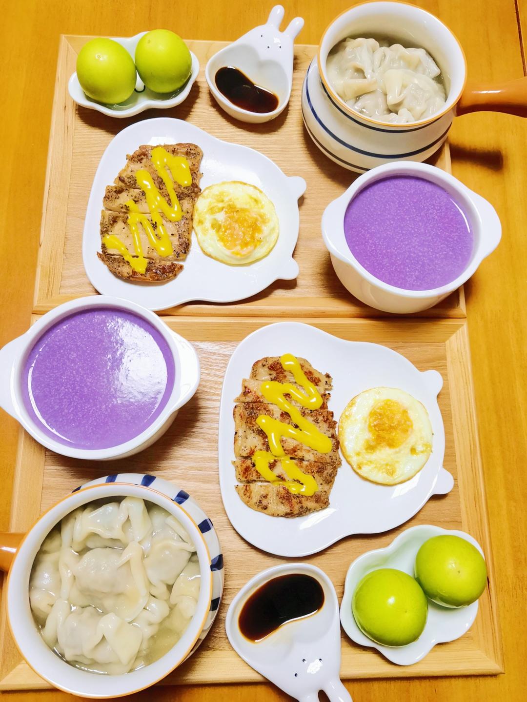 三鲜水饺、香煎鸡排、荷包蛋、奶枣、紫薯香芋糊