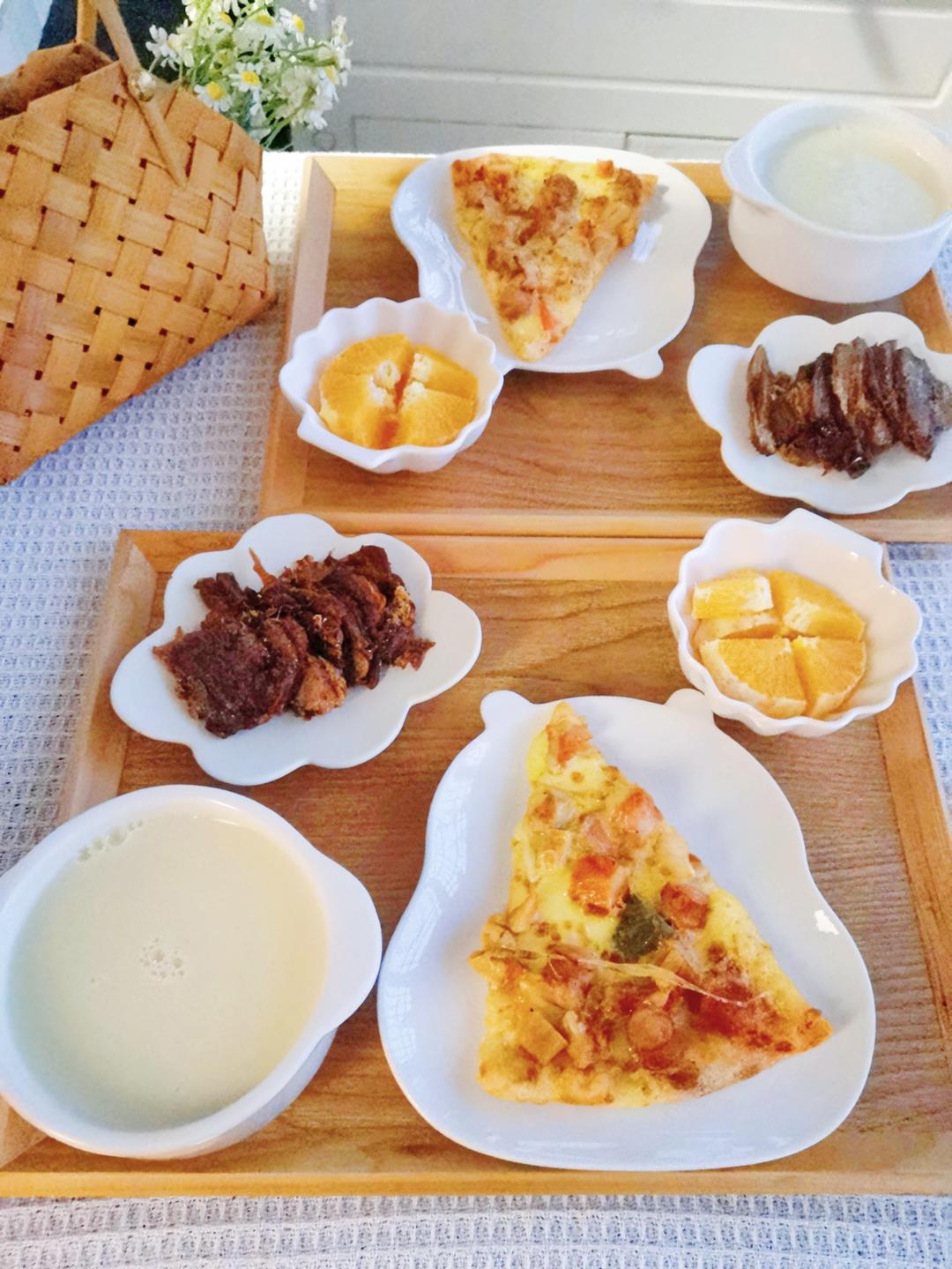 披萨、卤牛肉、橙子、豆奶