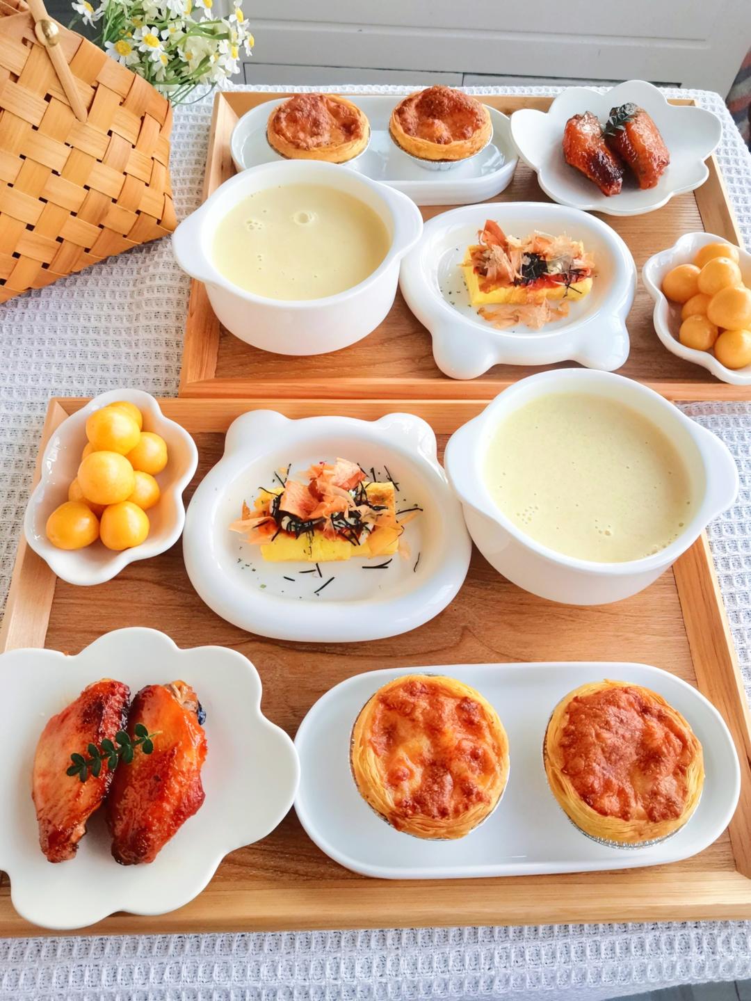 迷你蛋挞披萨、烤鸡翅、玉子烧、姑娘果、玉米汁